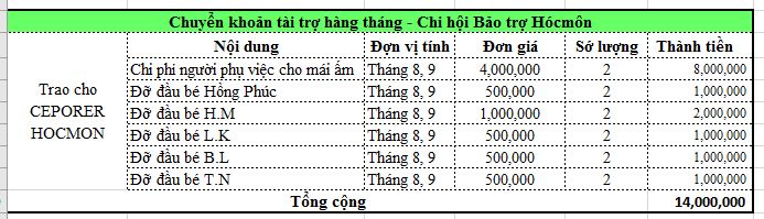 | Chi phí hỗ trợ tháng 8 và tháng 9 | 6,000,000 |