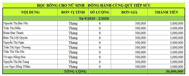 | Học bổng tháng 9, 10, 11, 12, 1/2020. 2/2020 cho nữ sinh | 30,000,000 |