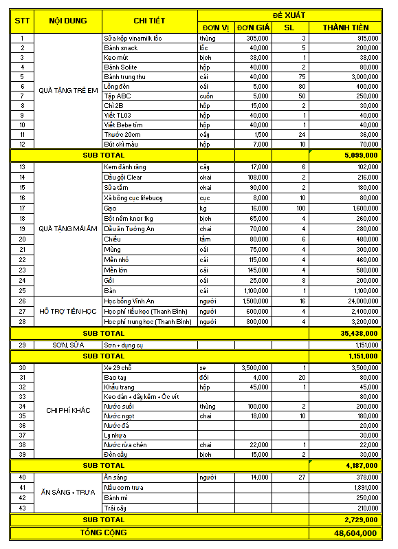 | Quà tặng cho các em và mái ấm | 40,537,000 |