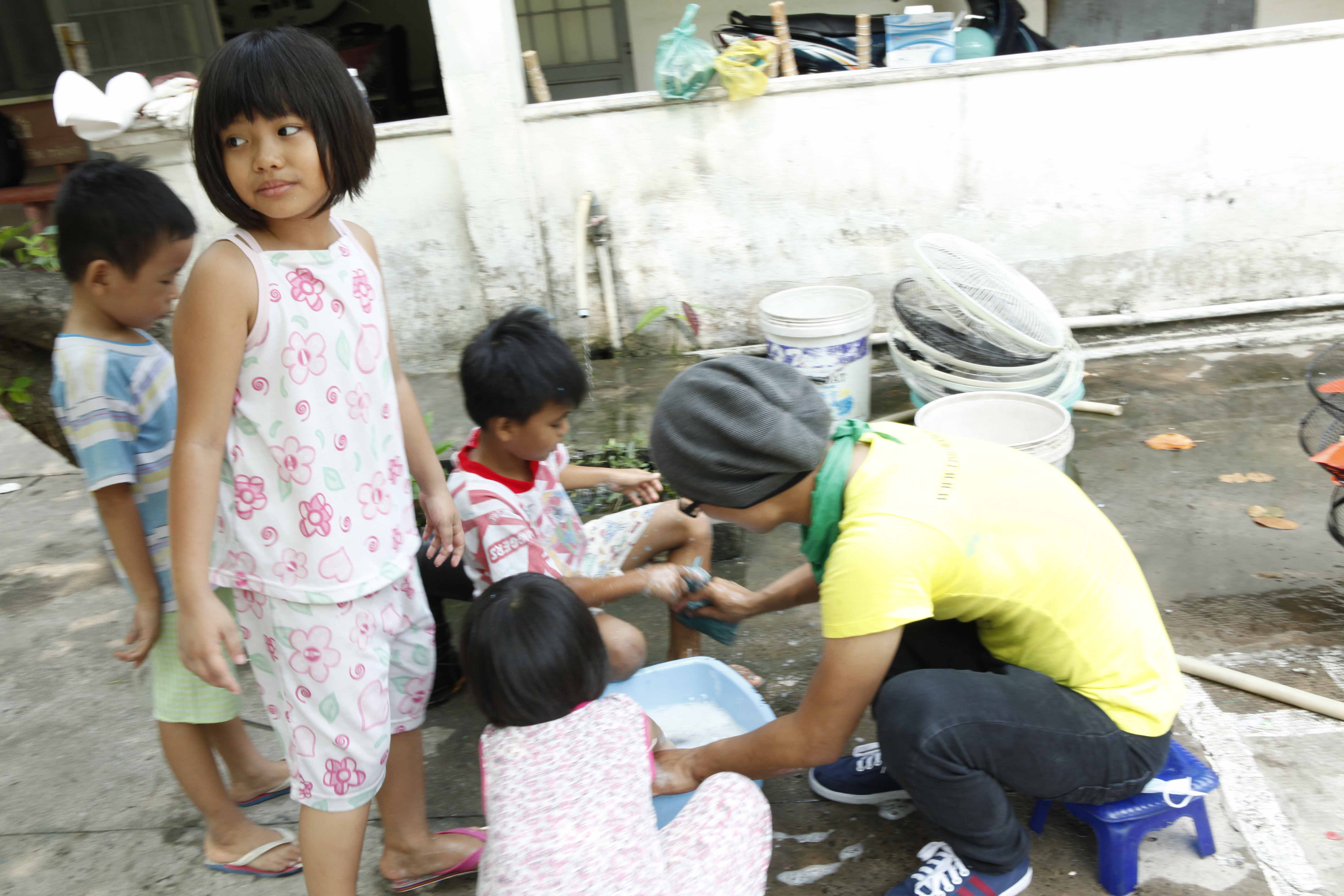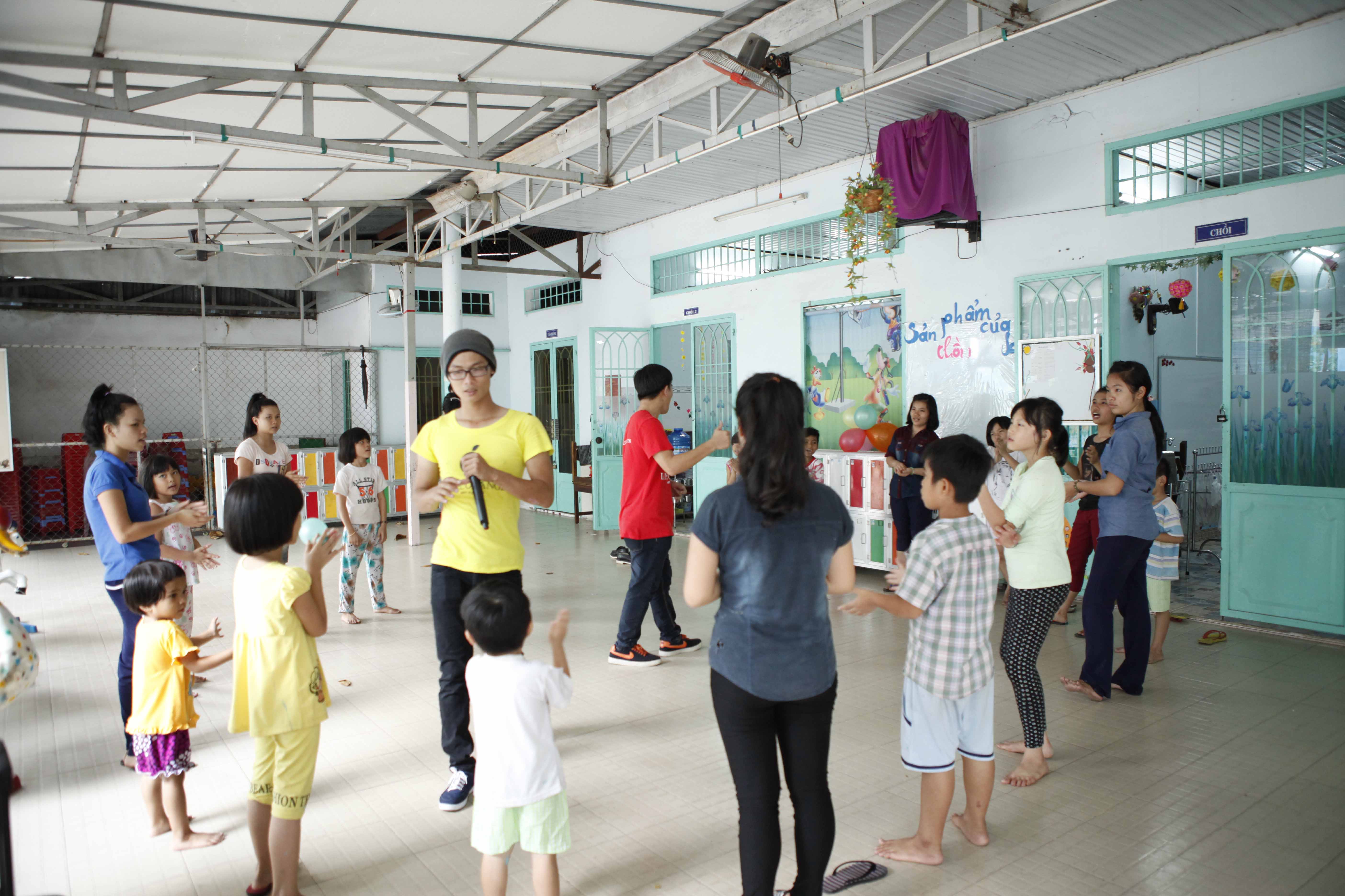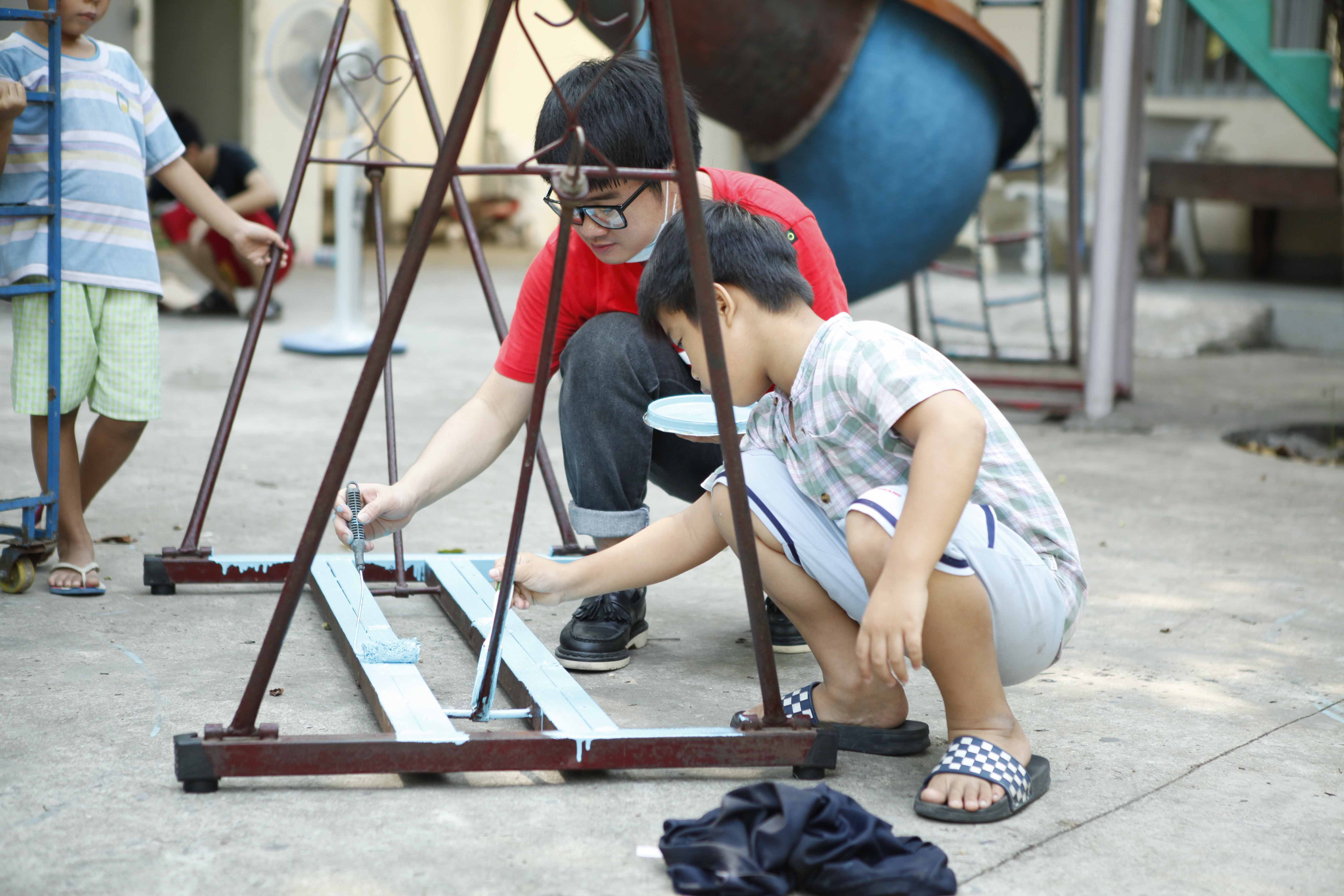 Tổ chức vui chơi cùng các em, dọn dẹp vệ sinh và sơn sữa tủ kệ. Hỗ trợ nhu yếu phẩm hàng ngày.