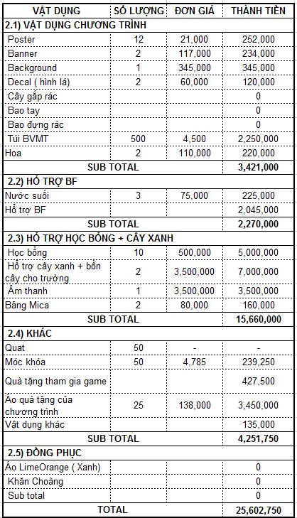 | Hỗ trợ học bổng và cây xanh | 15,660,000 |